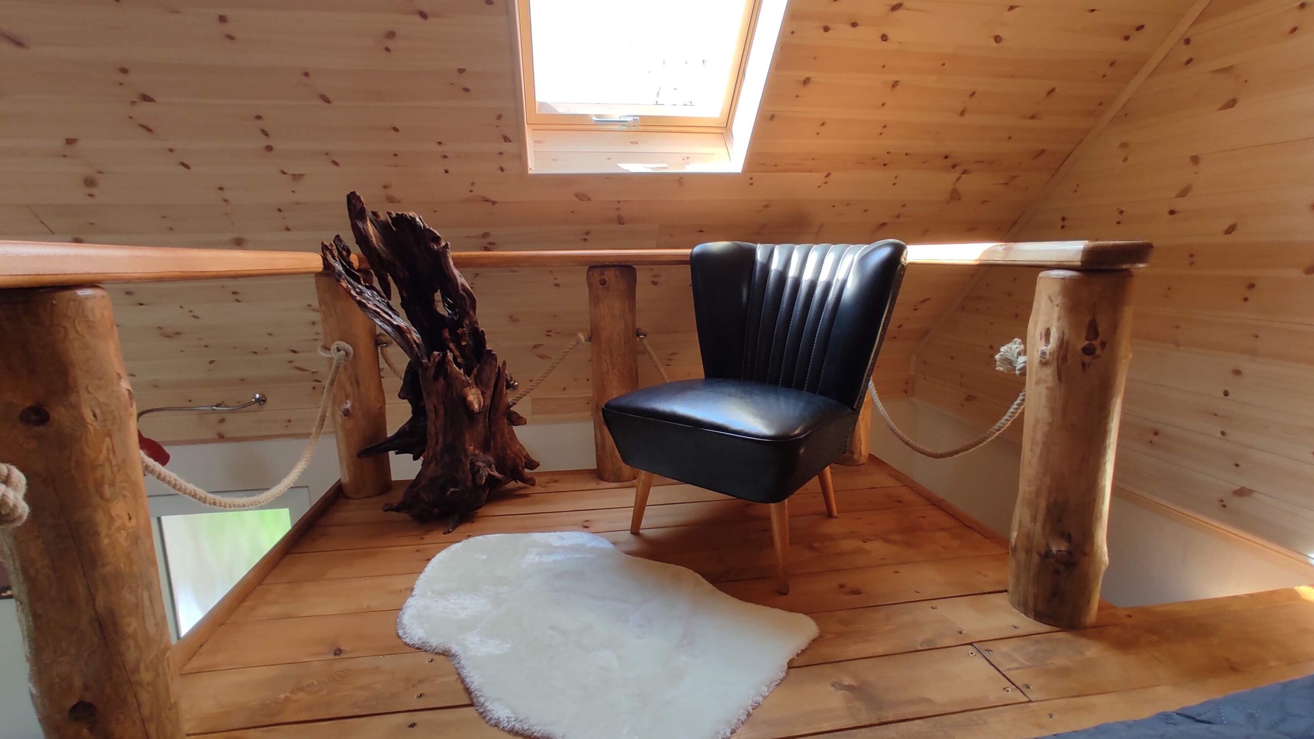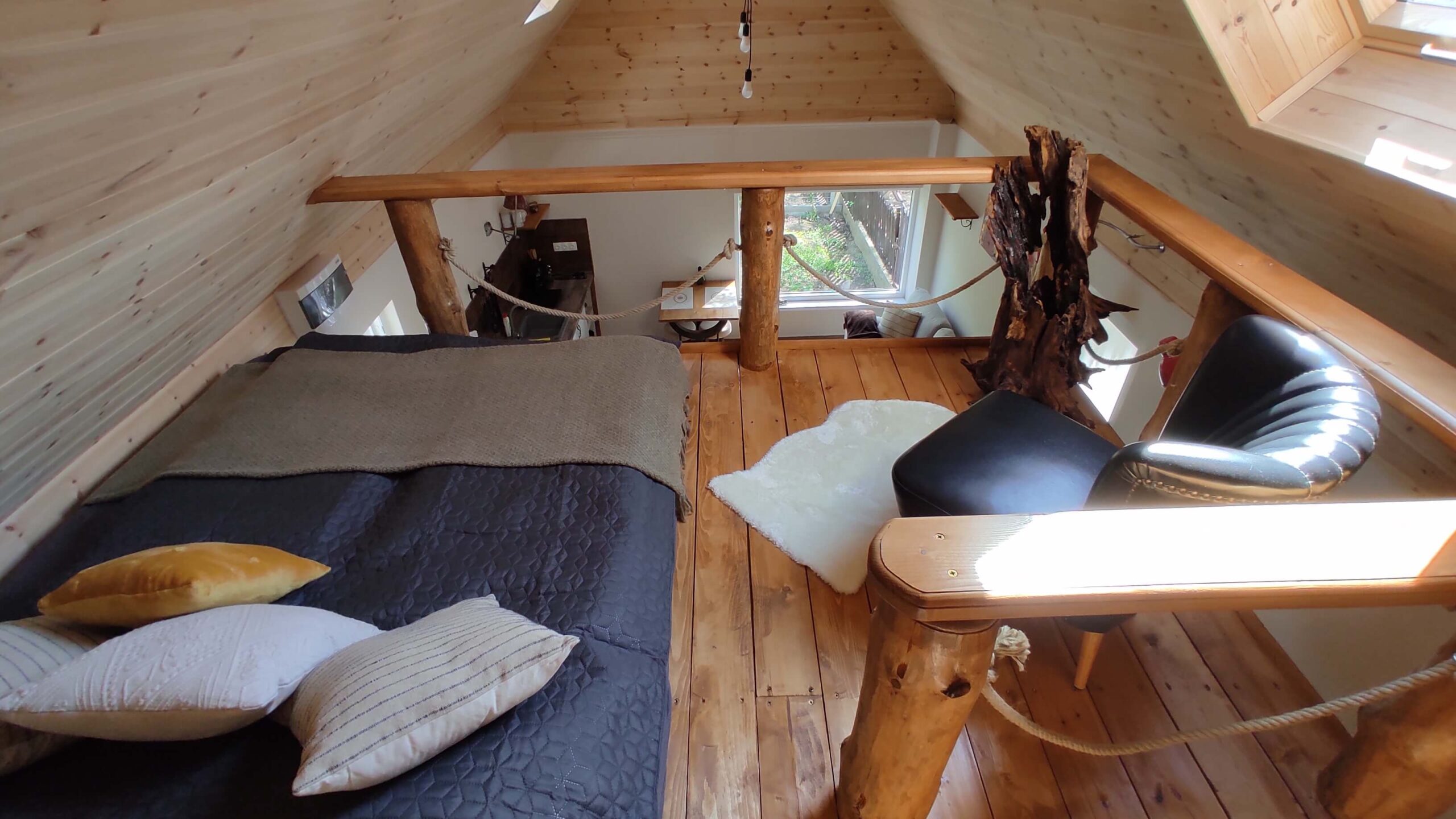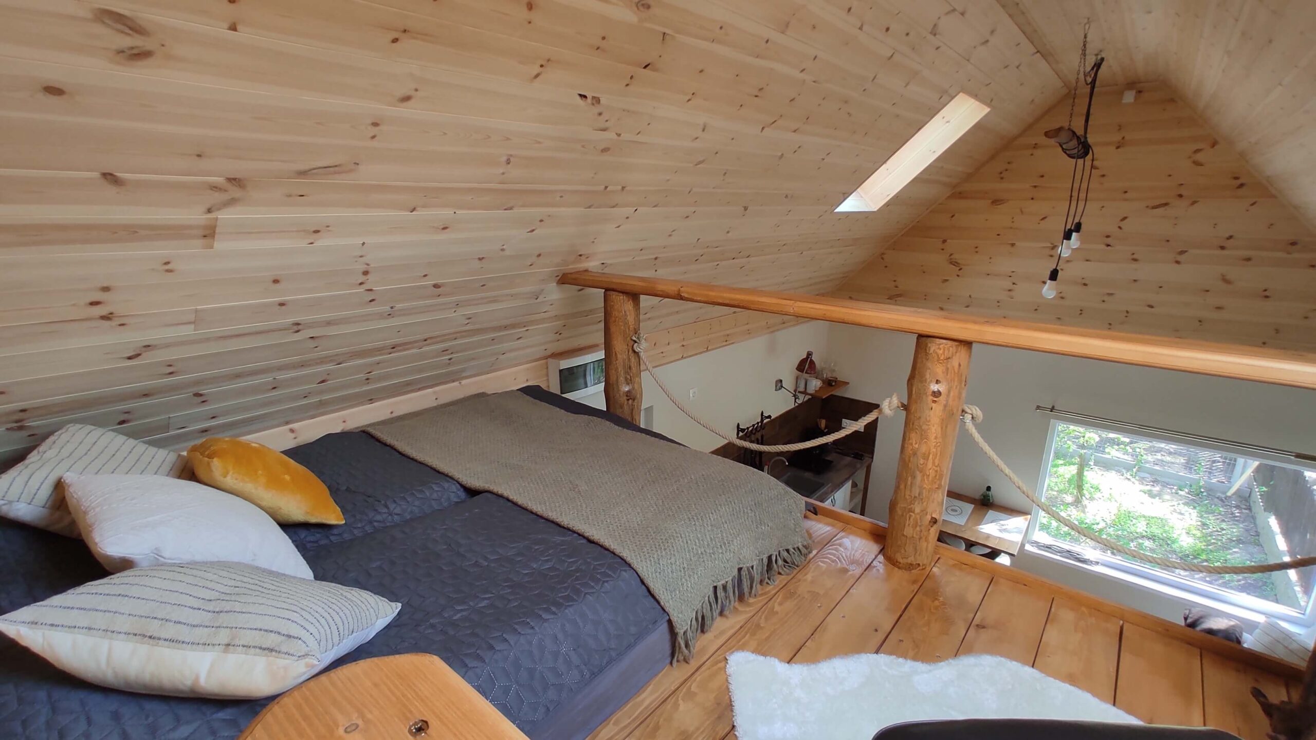konyha, nappali és fürdőszoba fölött egy gyönyörű, fából épített galéria